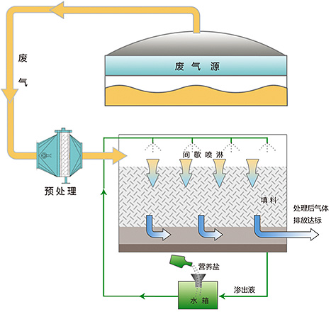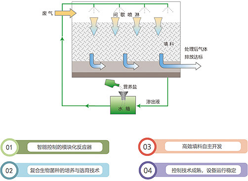 該類廢氣的污染成分主要是涂料及稀料在配料、生產過程中揮發出來的,主要成分集中在醇類、酯類,屬于生物降解的范疇,氣量大,VOCs濃度較低,進口濃度一般在100-200ppm。生物凈化設備可以實現低能耗的高效去除率。